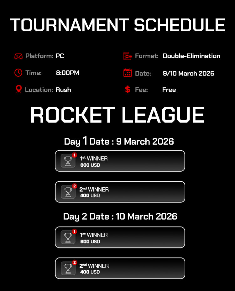 Experience the thrill of pure Rocket League competition in our fast-paced 3v3 tournament. Every match is a high-pressure duel filled with intense gameplay, clutch plays, and adrenaline-pumping moments. Show your skill and fight your way to victory!